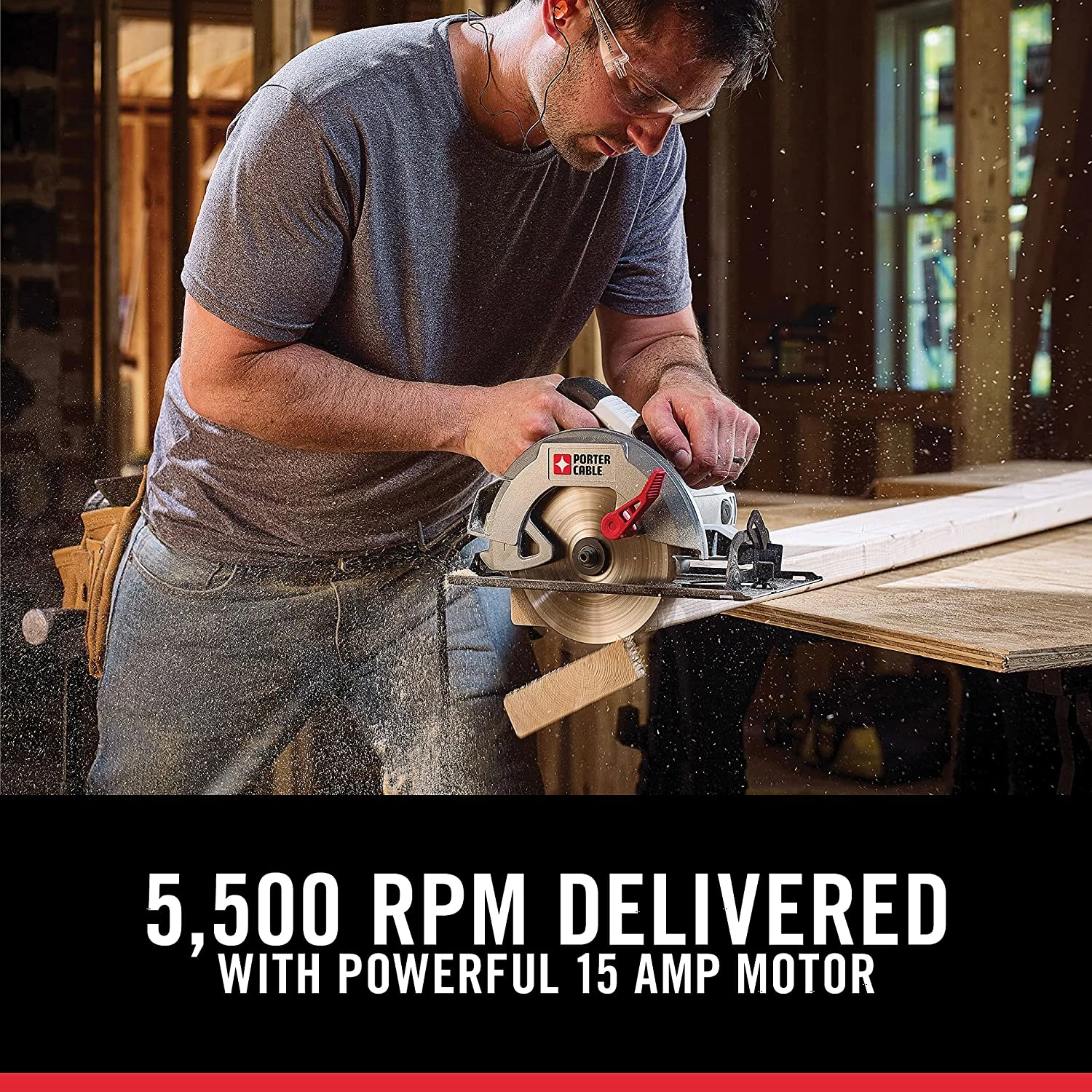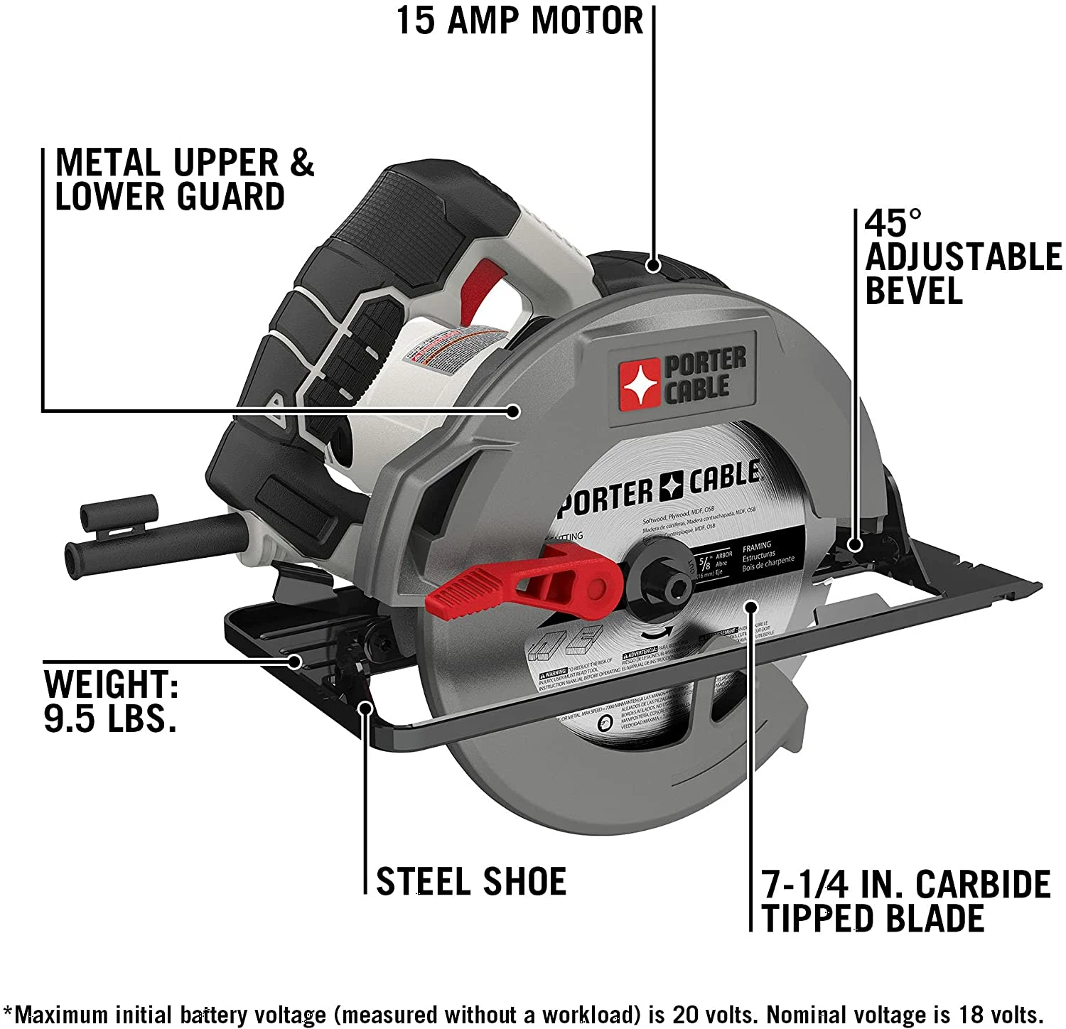 The PORTER-CABLE PCE300 15 amp heavy duty steel shoe Circular saw features a 15 amp motor, able to run up to 5,500 RPM to provide power and speed through all types of applications. This Circle saw has a steel shoe, along with metal upper